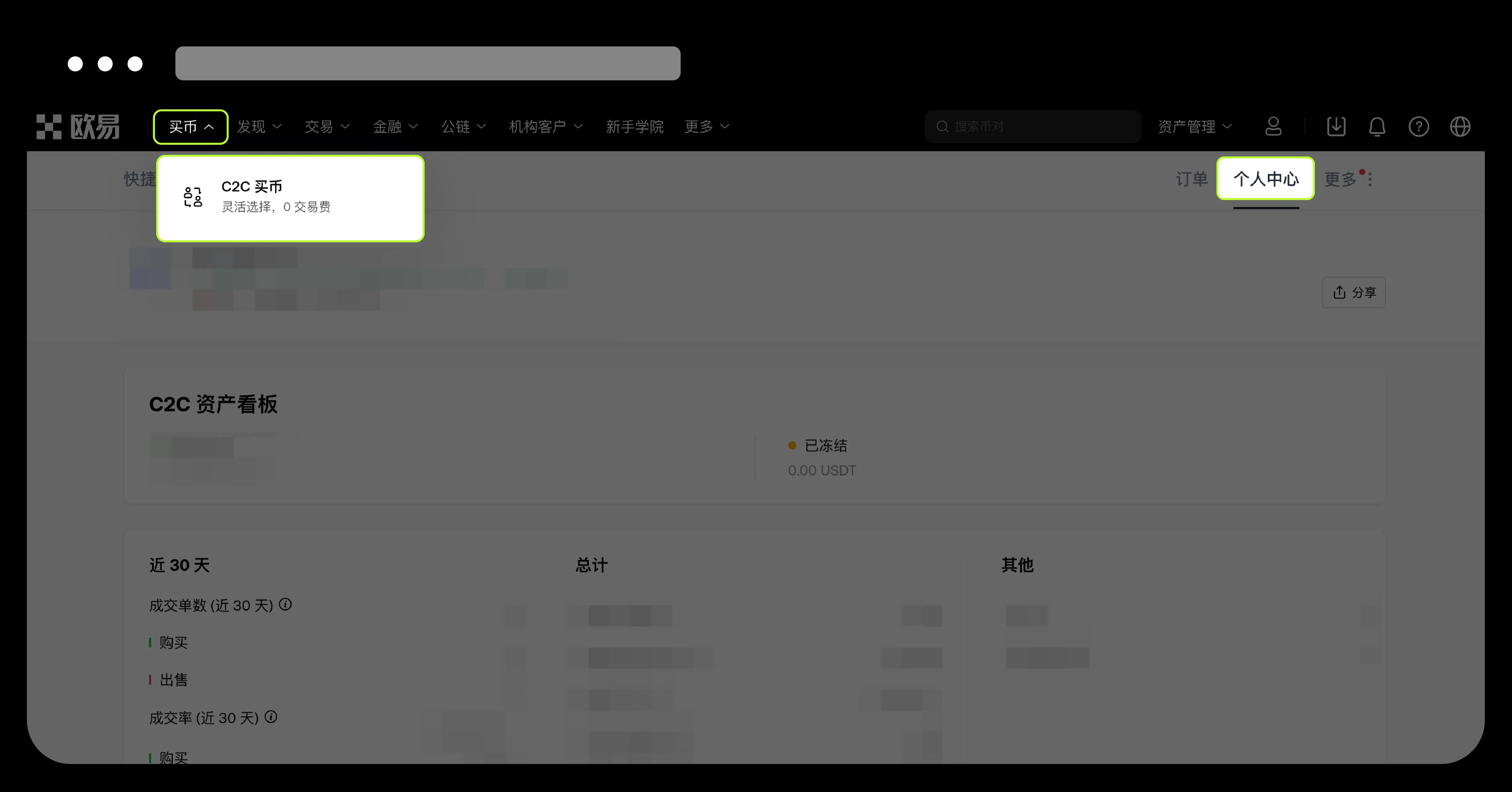 - 打开官网,点击【买币】-【C2C买币】- 在右上角点击【个人中心】;