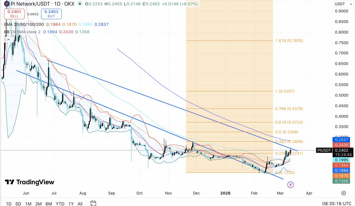 技术面显示,PI 指数重新站上短期均线,触及布尔带上轨,并突破了一条小型下降趋势线。然而,它仍低于 100 日均线和 200 日均线,表明长期趋势依然看跌。