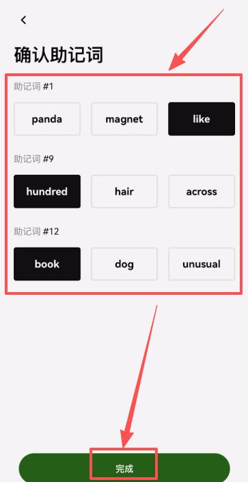 确认我们刚才记好的助记词,第一个是什么单词,第几个是什么单词。选好之后,点击【完成】。这样我们的钱包就备份好了。