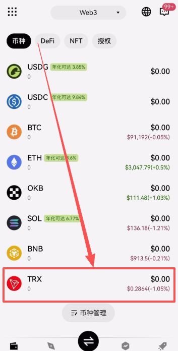 首先我们知道刚刚使用的这条链是TRON这条链,我们往下倒,可以看到这里有一个TRX这个币种。