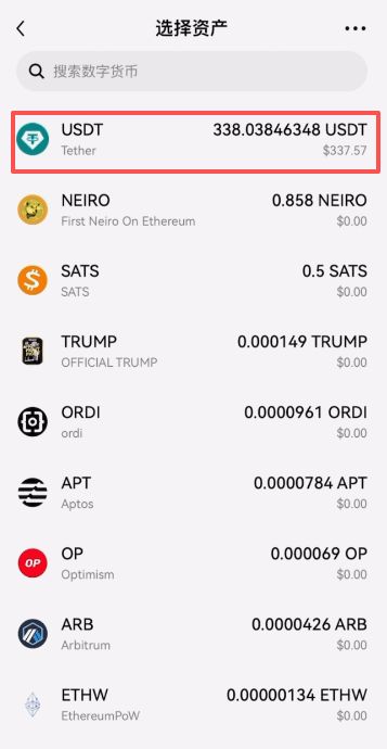 下一步就是要把交易所里面的USDT转到Web3钱包里面了。我们在下方找到USDT这个币种。
