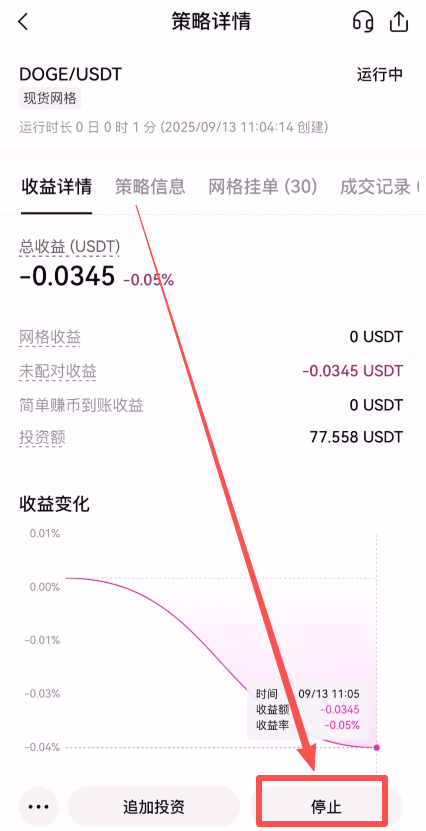 创建成功之后,我们就可以在策略交易里面找到“运行中”,找到你正在运行的网格。如果你不想继续去运行了,我们就可以点击“累计投入”这里。