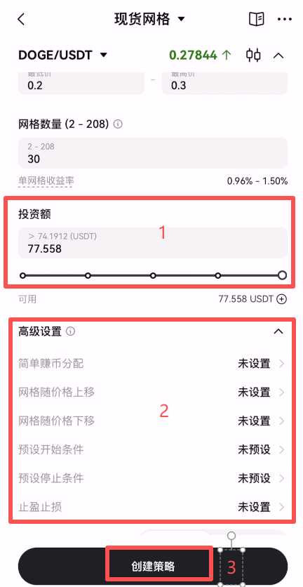 输入好价格区间和数量以后,接着输入我们想要投入的总金额,下面还有一些高级设置,你可以选择性地去设定一下。