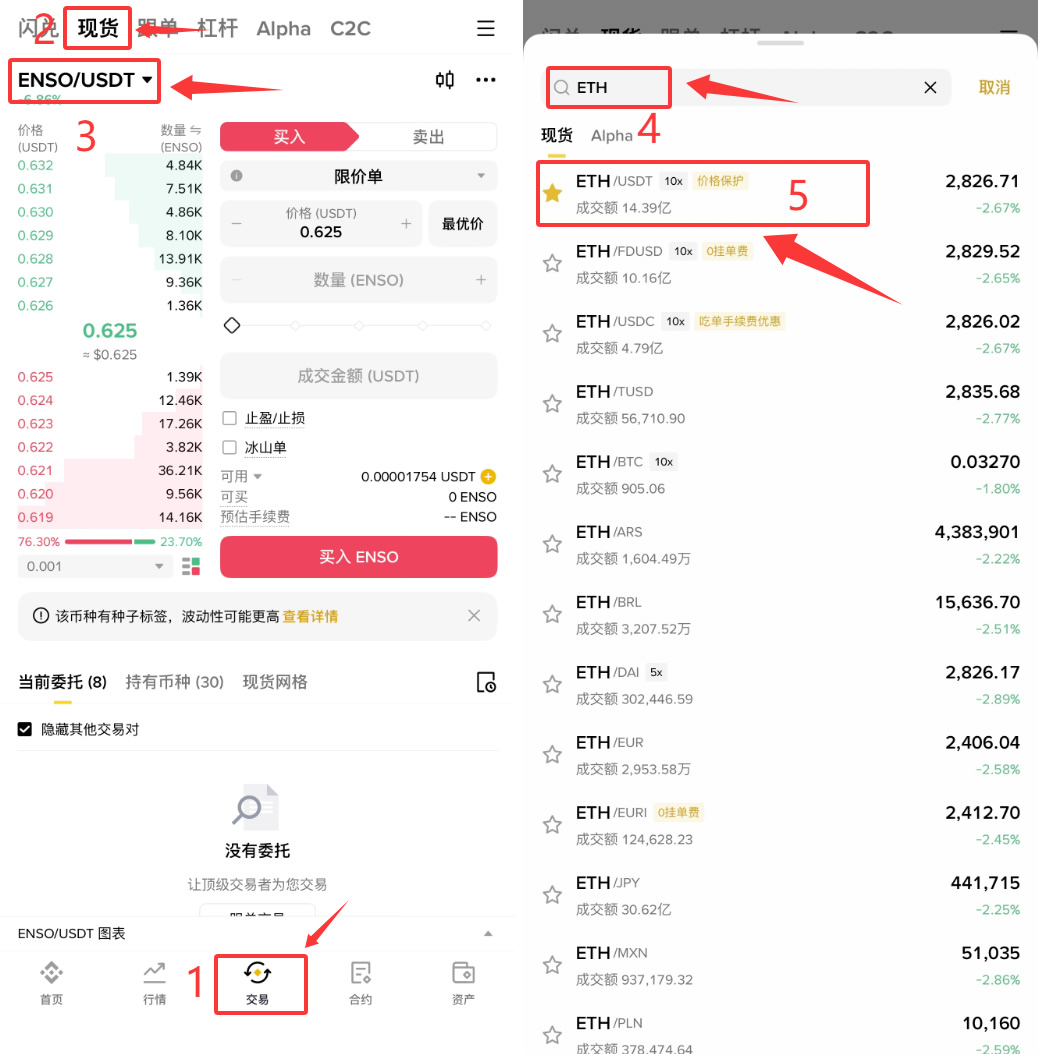 我们点击下方的【交易】,在“现货”交易的这个页面,左上角这里可以选择我们想要进行的交易对,比如说我想去购买比特币,那我就搜索“ETH”,然后选择“ETH/USDT”这个交易对。