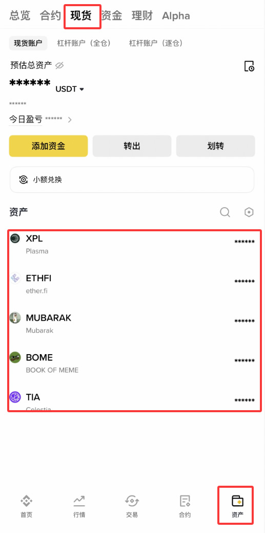 我们来到【资产】,可以看到我们购买好的USDT它首先是在资金账户里面的,如果我们想要去购买其他的加密货币,就需要把我们资金账户里面的USDT划转到现货账户。