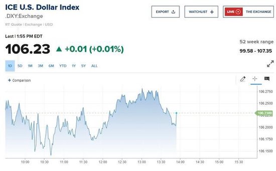 衡量兑六种主要货币的一篮子美元指数DXY止跌转涨,重上106.20,欧股时段曾升至106.49创4月16日以来的两周新高,如果突破106.51将创去年11月初以来最高。