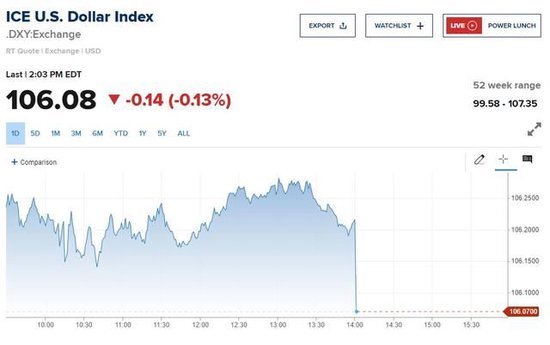 美元指数DXY日内重新转跌至106.10。现货黄金涨幅重新扩大至约1%并重上2300美元整数位,短线上扬大约6美元。