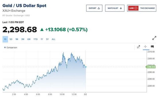 决策公布前5分钟,美元指数仍交投106.22,在当日涨跌之间徘徊。现货黄金涨幅略有收窄,仍交投2300美元一线。