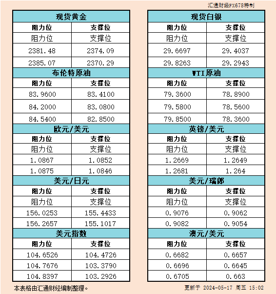 5月17日欧市支撑阻力:金银原油 美元指数等六大货币对