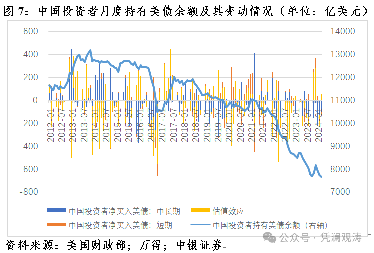 截至2024年3月底,中国投资者持有美债余额为7674亿美元,较上年底减少489亿美元,持有额降至2009年5月底以来的新低。其中,净卖出美债444亿美元(包括减持中长期美债447亿美元,增持短期美国国库券3亿美元),贡献了同期中资持有美债余额降幅的90.7%;负估值效应45亿美元,仅贡献了9.3%。可见,当季中资持有美债余额下降,主要是因为抛售了美债。2020年以来,中资已连续三年净卖出美债,分别为150亿、120亿和563亿美元(见图表7)。