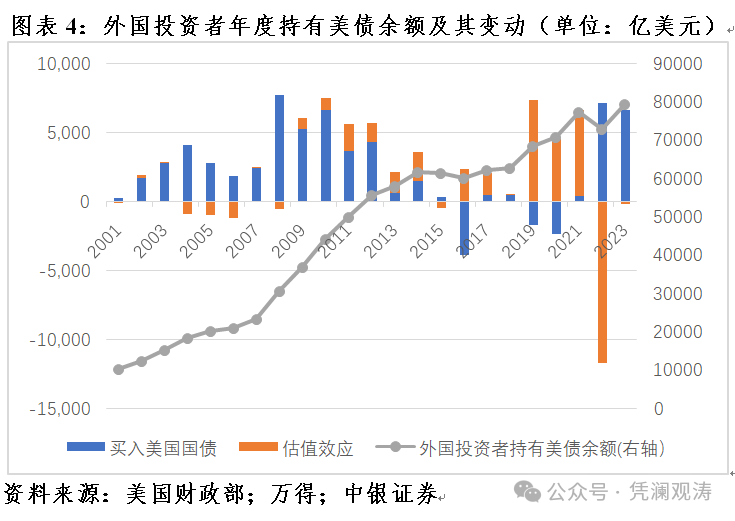 2022年全球“美元荒”期间,外国投资者净买入美国国债7166亿美元,规模仅次于2008年的7724亿美元,但因为美债收益率飙升、美债价格剧跌,产生巨额的负估值效应11669亿美元,导致外资持有美债余额下降4503亿美元至72901亿美元,降幅创2001年以来新低。2023年,外资净买入美债6659亿美元,同比略降7.1%,但当年负估值效应仅为151亿美元,全年外资持有美债余额增加6508亿美元至79408亿美元,持有额刷新历史纪录(见图表4)。