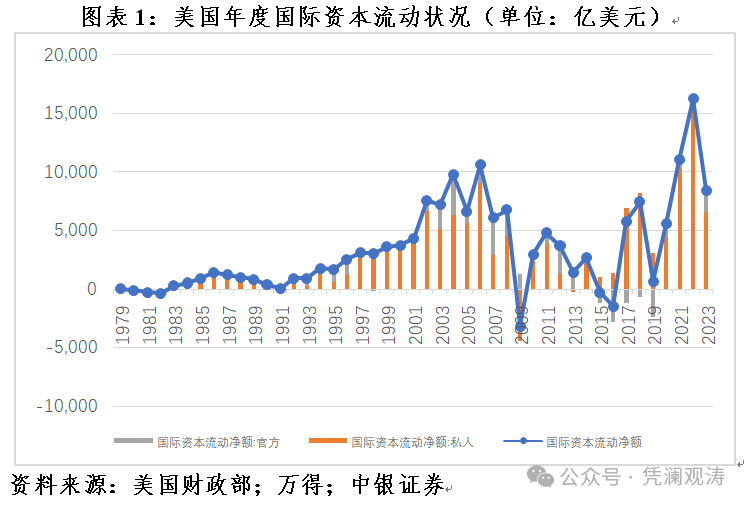 2022年,在高通胀回归、美联储激进紧缩的背景下,美债收益率和美元指数飙升,美国全年录得16233亿美元国际资本(主要是跨境证券投资)净流入,较上年增长47.0%,规模创下历史纪录。其中,私人资本净流入15973亿美元,增长54.3%,规模也达历史新高;官方资本净流入259亿美元,下降62.7%,这主要反映了当年非美货币普遍承压,部分国家抛售美元资产、干预本币贬值的影响(见图表1)。