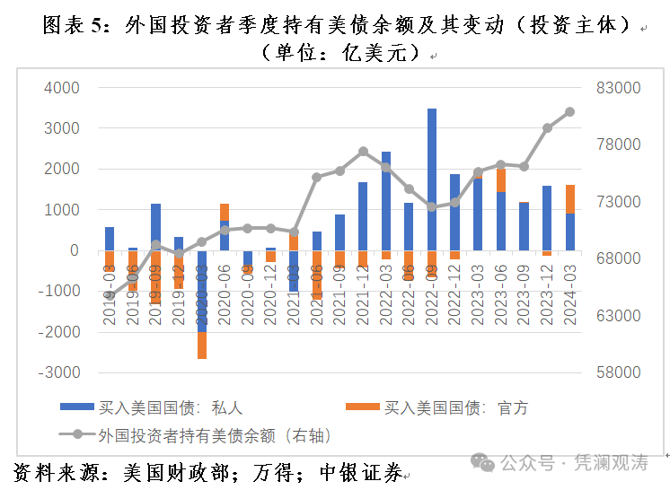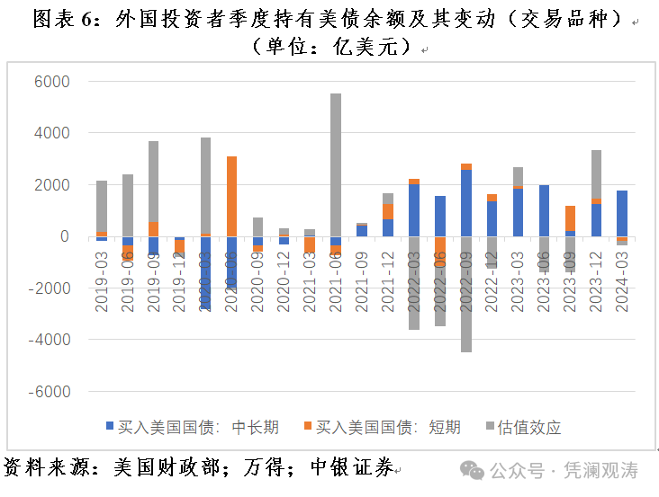 截至2024年一季度末,外资持有美债余额80918亿美元,较上年底增加1453亿美元,持有额再创历史新高。其中,外资净买入美债1622亿美元,贡献了同期新增美债持有额的111.6%,环比多增154亿美元,但净买入量低于2022和2023年分别季均1792亿和1665亿美元的水平;美债收益率小幅上行、美债价格小幅下跌,产生负估值效应169亿美元,为负贡献11.6%(见图表5)。