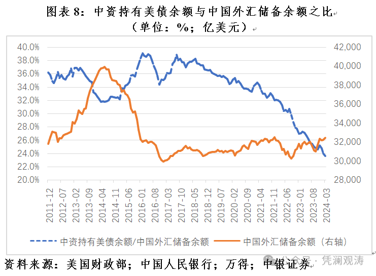 到2024年3月底,中资持有美债余额相当于中国外汇储备余额的23.6%,较2013年11月底回落了11.1个百分点,较2016年2月底高点39.1%回落了15.5个百分点(见图表8),显示美债在中国外汇储备资产配置中的重要性降低。2014年被西方制裁后,俄罗斯曾经清仓式减持美债,转换成了黄金储备。然而,对于中国来讲,这并非易事。如自2022年11月起中国持续净增持黄金储备,到2024年3月累计增持了1010万盎司,约合193亿美元,远不及同期净减持美债1037亿美元的规模。