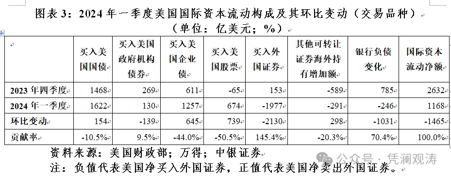 从投资主体看,私人资本净流入锐减是主要贡献项。一季度,私人资本净流入119亿美元,环比减少94.6%,下降2073亿美元,贡献了同期美国资本净流入降幅的141.5%;官方资本净流入1049亿美元,环比增长1.38倍,增加609亿美元,为负贡献41.5%(见图表2)。2024年4月份,以日元、韩元、印度卢比为代表的亚洲货币普跌,亚洲货币保卫战的炒作又甚嚣尘上,甚至月底日本央行重新入场干预。这些都是新近发生的情况,未反映在一季度的官方资本流动中。
