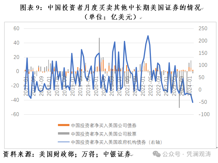 此外,观察中国对美金融风险敞口也不能止步于美债。如2017年9月~2024年3月,中资净增持美国政府机构债4435亿美元,增持美国企业债165亿美元,净减持美国股票289亿美元,三项合计净增持中长期美国证券4311亿美元,远大于同期净减持美债2883亿美元的规模。不过,近年来情况有所改变。2022年,中资净减持美债120亿美元,却净增持前述三项美国证券资产合计1213亿美元;2023年,中资净减持美债563亿美元,净增持前述三项美国证券资产合计48亿美元;2024年一季度,中资在减持444亿美元美债的同时,还减持了前述三项美国证券资产合计59亿美元(见图表9)。