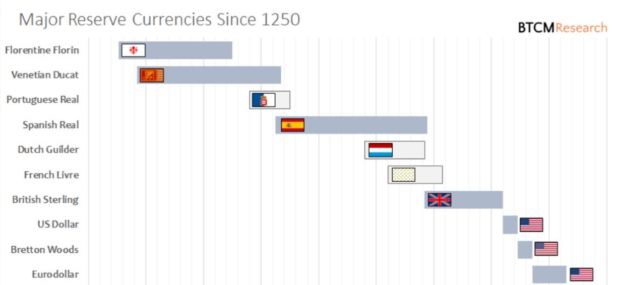 乔恩进一步阐述,随着历史的进步,成为全球储备货币的时间窗口缩短,主要是因为世界变得更小更短,这意味着从一个大陆到另一个大陆的旅行时间迅速减少。