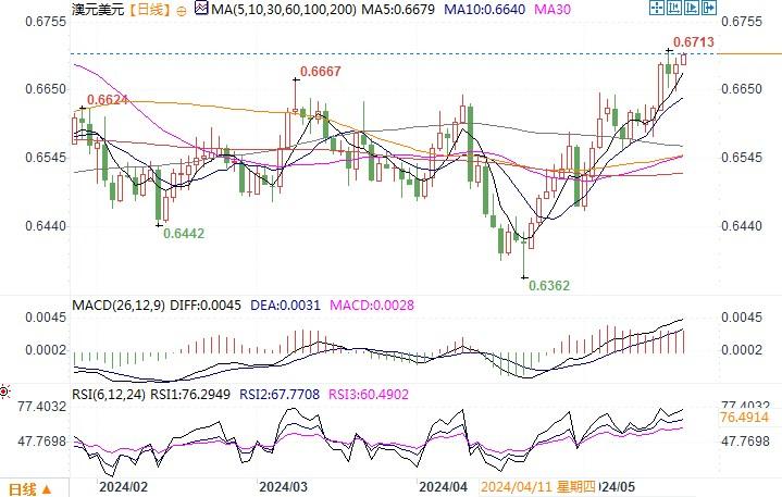 周五(5月17日),澳元兑美元先抑后杨,当日微涨0.2%收盘于0.6692。上周澳元/美元一度触及四个月高点,这得益于美国提早降息的预期提升。但来自澳洲公布数据显示,虽然就业人数增幅超过预期,失业率意外上升并创三个月高点,似乎降低了澳洲央行再次升息的可能性,也是一定程度上抑制了澳元的走高欲求。目前利率期货报价暗示,澳洲央行最早在12月降息的可能性约为50%,市场已经完全消化了到明年4月利率将下调25个基点的可能性。若市场上对于澳联储降息时点预期越延后,预料对澳元则越有利,澳元/美元也会借此有望进一步被推高。日线图上,澳元/美元维持上行姿态,汇价紧贴布林带上轨线,技术指标保持完好的上顷趋向,显示澳元上行动能较强。只要汇价保持在0.6630之上,澳元/美元有望向更高水平攀升。