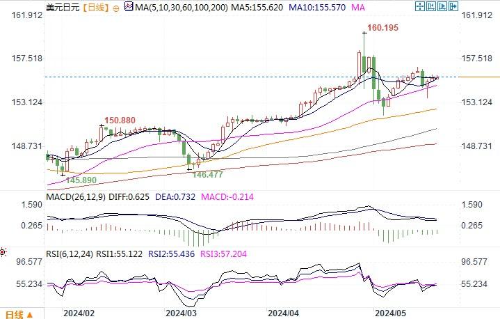 周五(5月17日),美元兑主要货币回落,美元指数下跌0.04%至104.44。但美元兑日元仍略微保持着涨势,当日上涨0.17%收盘于155.65。从上周美国公布的种种数据显示,美国通胀虽有所降温但仍高企,而经济发展则有趋软迹象。美国经济增长势头放缓的迹象,似乎在转化为削弱美元上行的影响因素。但在周二的数据显示4月生产者物价跳涨之后,市场对美联储短期内降息的前景转为谨慎。而且周内多位美联储官员对何时可能降息仍很谨慎,政策制定者们上周四甚至表示,通胀仍居高不下,需要将利率维持在当前水平,达到美联储2%目标所需的时间将比之前想象的要长。因此尽管美元兑其他一些主要货币周五略有下跌,但美日之间的巨大利差,仍是驱动美元保持强势的主要推手。日线图上,美元/日元维持升势,汇价顽强挺进至布林带中轨线之上,显示美元涨势未竭。上方157.04的阻力较为关键,该位置是2024年160.24至151.86跌势的61.8%费波纳奇回档位,若美元/日元继续上行穿越该位置,则美元有望进一步攀高。若继续遇阻于该位置,则当心美元/日元渐渐夯实顶部,后市转入逐步下行的风险。