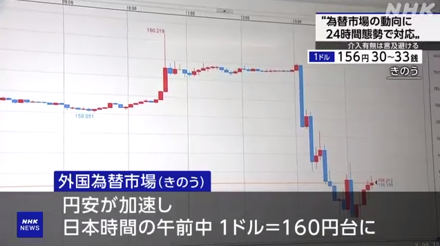 29日,日元对美元汇率一度跌破160,再创1990年4月以来新低。NHK电视台称,虽然日本当天是节假日,交易量较少,但人们认为日美利差扩大,加速出售日元购入美元。之后,日元对美元自低点迅速大幅反弹,最高升至154.52,呈大幅波动。