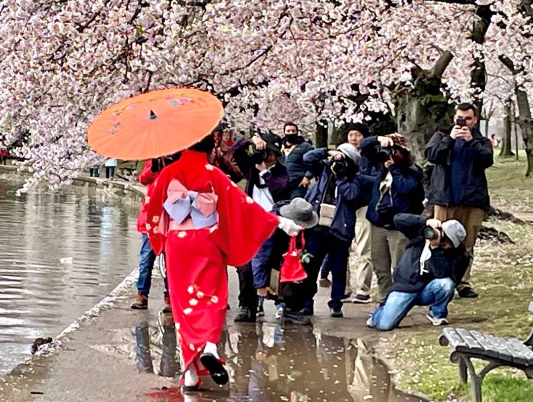 图片说明,由于日元大幅贬值,引发日本民众出国游大受影响。目前正值日本“黄金周”,一些民众表示日元持续贬值给出国旅行带来不小压力,甚至有人放弃出行计划。图为一小型日本旅游团在华盛顿樱花节期间赴美旅游。摄/金焱