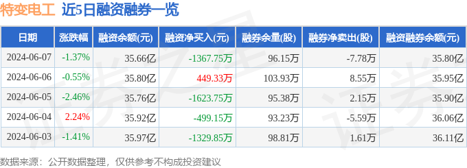 特变电工融资融券信息显示,融资方面,当日融资买入8247.67万元,融资偿还9615.42万元,融资净偿还1367.75万元。融券方面,融券卖出7.89万股,融券偿还15.67万股,融券余量96.15万股,融券余额1383.58万元。融资融券余额35.8亿元。近5日融资融券数据一览见下表: