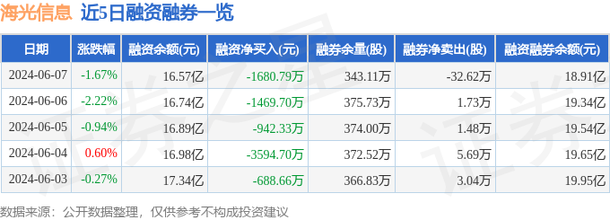 海光信息融资融券信息显示,融资方面,当日融资买入7115.12万元,融资偿还8795.91万元,融资净偿还1680.79万元。融券方面,融券卖出1.6万股,融券偿还34.22万股,融券余量343.11万股,融券余额2.34亿元。融资融券余额18.91亿元。近5日融资融券数据一览见下表: