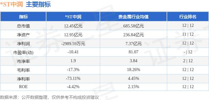 *ST中润2024年一季报显示,公司主营收入4998.35万元,同比下降29.48%;归母净利润-2989.59万元,同比上升21.11%;扣非净利润-2816.7万元,同比上升24.47%;负债率44.05%,财务费用1253.38万元,毛利率-17.3%。*ST中润(000506)主营业务:以黄金为主要品种的矿业开采与房地产开发建设、销售及自有房产的出租。